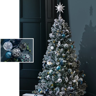 Blue Silver Christmas Baubles The Blue Silver colour scheme looks stylish on any colour of tree but looks best on white black and flocked trees.
